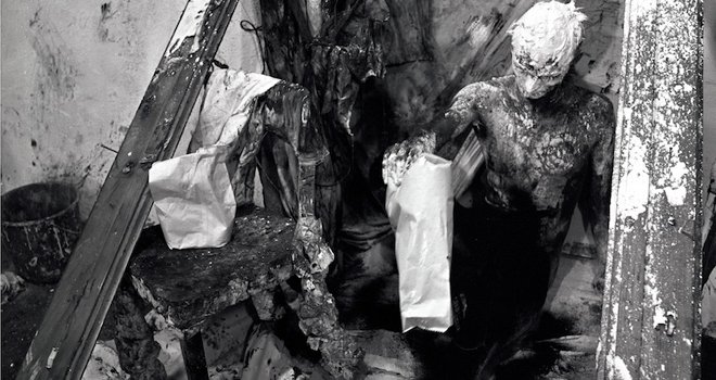 Το έργο που παρουσιάζεται αποτελείται από δεκατρείς ασπρόμαυρες φωτογραφίες που απαθανατίζουν τη δράση "SELBSTVERSTRICKUNG" (1965 - 2013), η οποία έλαβε χώρα στο υπόγειο Perinet της Βιέννης το 1965 και κατέγραψε ο φακός του Ludwig Hoffenreich. Η δράση παρέμεινε θαμμένη στο προσωπικό αρχείο του Günter Brus μέχρι τον Οκτώβριο του 2010. Ο Brus σημειώνει για αυτή την δράση: "Μία κορνίζα ύψους δύο μέτρων φυλάχθηκε στο θρυλικό Perinetkeller. Αφού την επένδυσα με μολίνα, στη συνέχεια έσχισα τον καμβά και κουλουριάστηκα μέσα της σε στάση εμβρύου. Σκοπός μου ήταν να αναδυθώ μέσα από το κάδρο ως ζωντανή εικόνα. Κατά την διάρκεια της δράσης περιήλθα σε τέτοια κατάσταση έκστασης ώστε τεμάχισα ολότελα τον καμβά και διεπλάχθηκα μαζί του. Η "ζωντανή εικόνα" καταστράφηκε και τερμάτισα τη δράση περιλούοντας τον εαυτό μου με λευκή και μαύρη μπογιά".