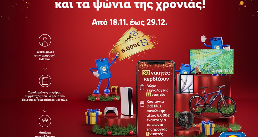 H Lidl Κύπρου υποδέχεται τη χριστουγεννιάτικη περίοδο με έναν εορταστικό διαγωνισμό για τα μέλη του Lidl Plus, γεμάτο δώρα που ανεβάζουν τη διάθεση και τον ενθουσιασμό των πελατών της. Φέτος, από τις 18 Νοεμβρίου έως και τις 29 Δεκεμβρίου, οι χρήστες της εφαρμογής Lidl Plus θα μπορούν να συμμετέχουν στον διαγωνισμό για δώρα αξίας χιλιάδων ευρών. Με 30 τυχερούς νικητές, οι πελάτες διεκδικούν κουπόνια συνολικής αξίας έως και 6.000€, ηλεκτρονικές συσκευές, και άλλα αγαπημένα δώρα τεχνολογίας.