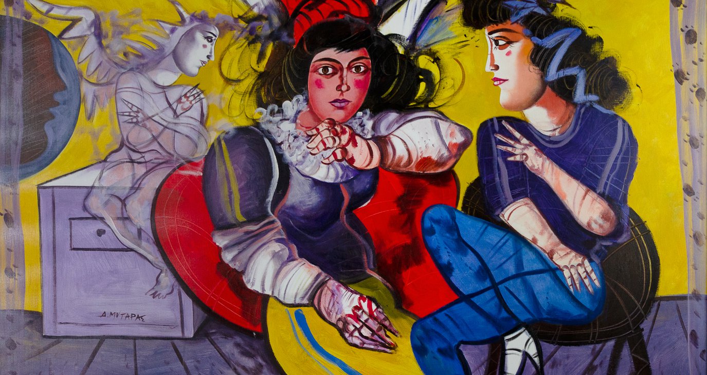 Στο έργο αυτό του Δημήτρη Μυταρά βλέπουμε δύο γυναικείες καθιστές μορφές και έναν ερωτιδέα να τις ατενίζει. Εδώ τα τρία βασικά χρώματα του κίτρινου, μπλε και κόκκινου συνδυάζονται περίτεχνα εκπέμποντας μια ένταση που συγκινεί. Το κίτρινο του φόντου, σχεδόν εκτυφλωτικό, εξαυλώνει και μεταβάλλει τον επίπεδο χώρο δημιουργώντας μια αντίστιξη ως προς το μωβ χρώμα που το περιβάλλει. Τα θερμά κόκκινα που κυκλώνουν την κεντρική φιγούρα δημιουργούν μια εστία χρωματικής έντασης που ισορροπεί τον πίνακα και δονεί την όλη σύνθεση. Έτσι, ο καλλιτέχνης με δυνατές χρωματικές ποιότητες δημιουργεί μια μαγευτική εικόνα πρωτότυπη και έντονα επιβλητική.