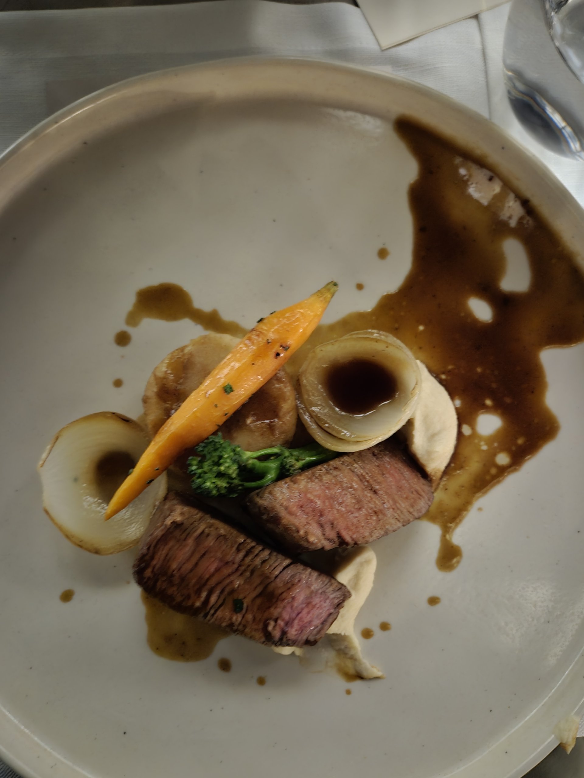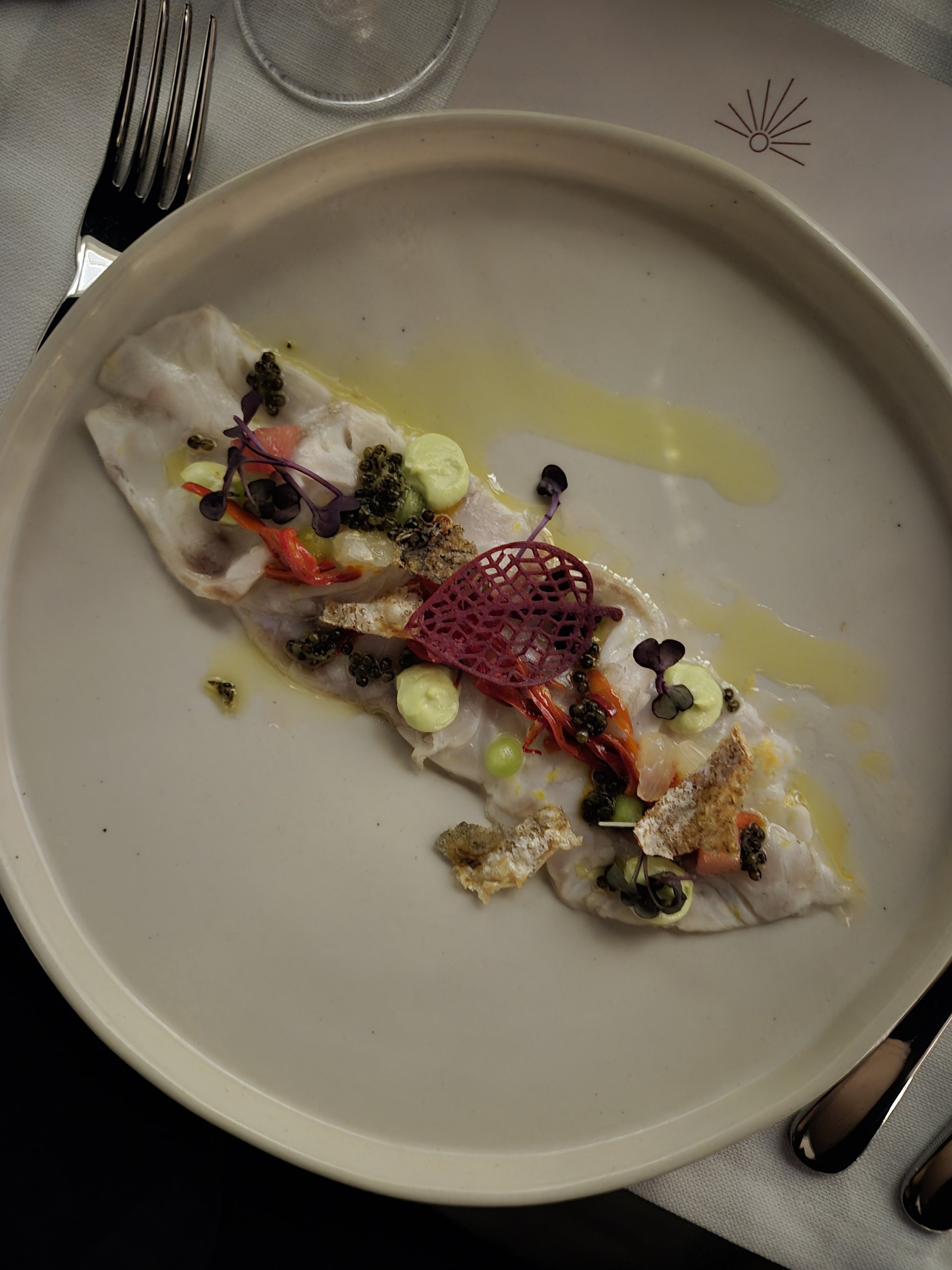 Στην πρώτη μας επίσκεψη, εμείς δοκιμάσαμε το Salt Baked Daikon Radish, ένα πιάτο όλο δροσιά, με ζελέ από παντζάρι, μήλο και βαλσάμικό, το Sea Bass Cru, που ήταν ένα λαβράκι όλο γεύσεις και αρώματα, με κόκκινο πιπέρι, αβοκάντο, χαβιάρι και dressing εσπεριδοειδών. Το κυρίως μας, ένα μοσχαρίσιο φιλέτο, με πρόκολο, baby καρότα, πατάτες Fondant και σος κόκκινου κρασιού, συμφωνήσαμε όλοι ότι ήταν απίστευτα γευστικό. Την εμπειρία μας ολοκλήρωσε το γλυκό, που απογείωσε τον ουρανίσκο μας.