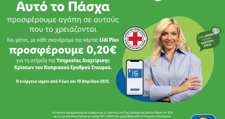 Συγκεκριμένα, και αυτό το Πάσχα, από την Παρασκευή 4 μέχρι και το Σάββατο 19 Απριλίου, με κάθε σκανάρισμα της ψηφιακής κάρτας Lidl Plus, η Lidl Κύπρου θα προσφέρει 0,20€ στον Κυπριακό Ερυθρό Σταυρό, για την στήριξη της Υπηρεσίας Διαχείρισης Κρίσεων.