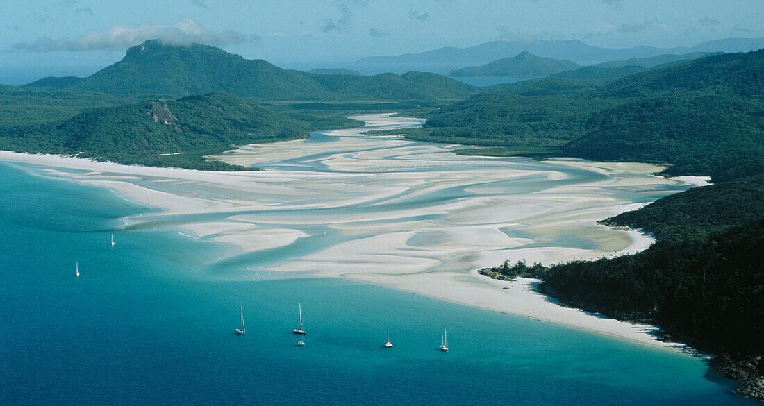 Στην κορυφή είναι η παραλία Whitehaven Beach, που βρίσκεται στο Εθνικό Πάρκο Whitsundays στο Κουίνσλαντ της Αυστραλίας και έχει χαρακτηριστεί ως μνημείο Παγκόσμιας Πολιτιστικής Κληρονομιάς. Αν τα όμορφα γαλαζοπράσινα νερά δεν ήταν αρκετά για να τη θαυμάσετε, η άμμος εδώ αποτελείται κατά 98% από διοξείδιο του πυριτίου. Αυτό σημαίνει ότι είναι πιο μαλακή και πιο λευκή από σχεδόν οπουδήποτε αλλού στον κόσμο.