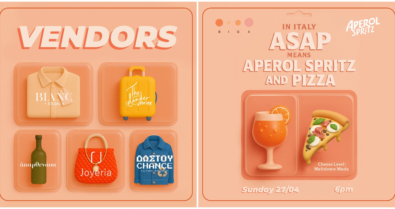Στην Ιταλία, το ASAP σημαίνει Aperol Spritz And Pizza — και φέρνουμε την ίδια ενέργεια στο Biga αυτή την Κυριακή. Περιμένετε μια ζωντανή βραδιά με γουλιά, σνακ και ψώνια με μια επιμελημένη σειρά πωλητών που περιλαμβάνει: