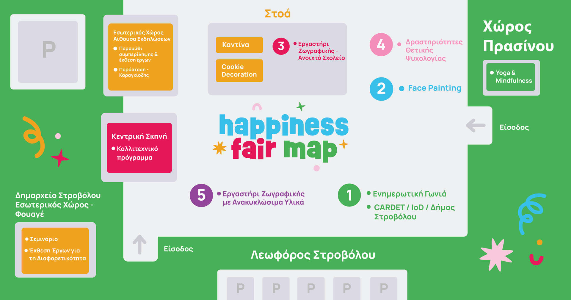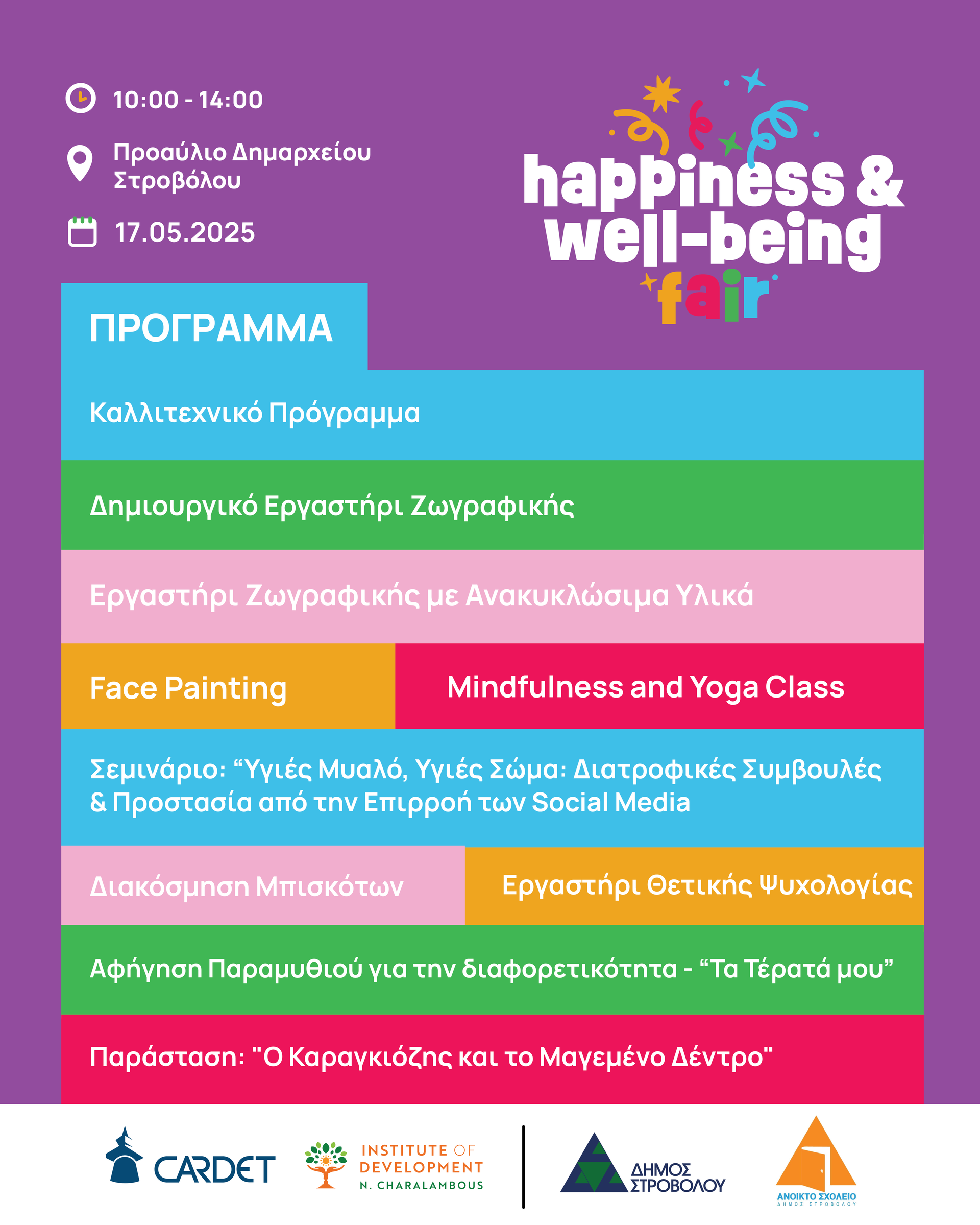 Ο Δήμος Στροβόλου και το Ανοικτό Σχολείο Δήμου Στροβόλου σε συνεργασία με το CARDET και το Ινστιτούτο Ανάπτυξης - Ν. Χαραλάμπους διοργανώνουν το Happiness & Well-Being Fair για δεύτερη συνεχή χρονιά, το Σάββατο 17 Μαΐου, από τις 10:00 έως τις 14:00, στον προαύλιο χώρο του Δημοτικού Μεγάρου Στροβόλου.