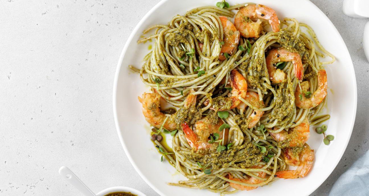 Σπαγγέτι με γαρίδες και πέστο βασιλικού