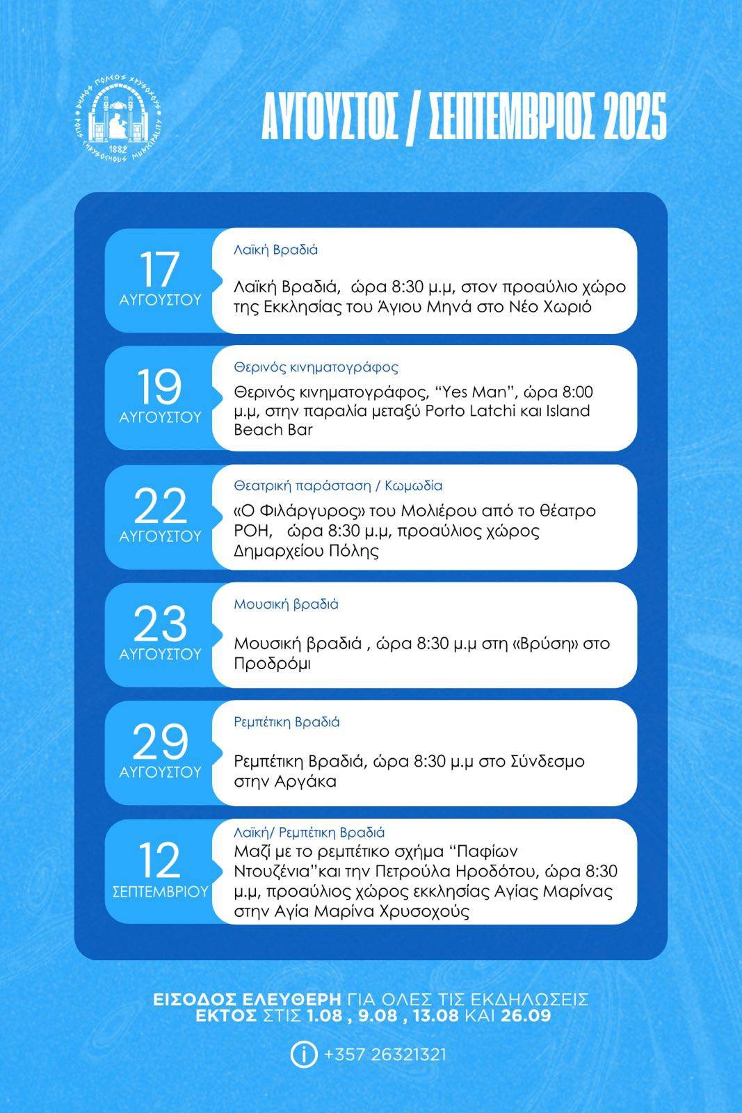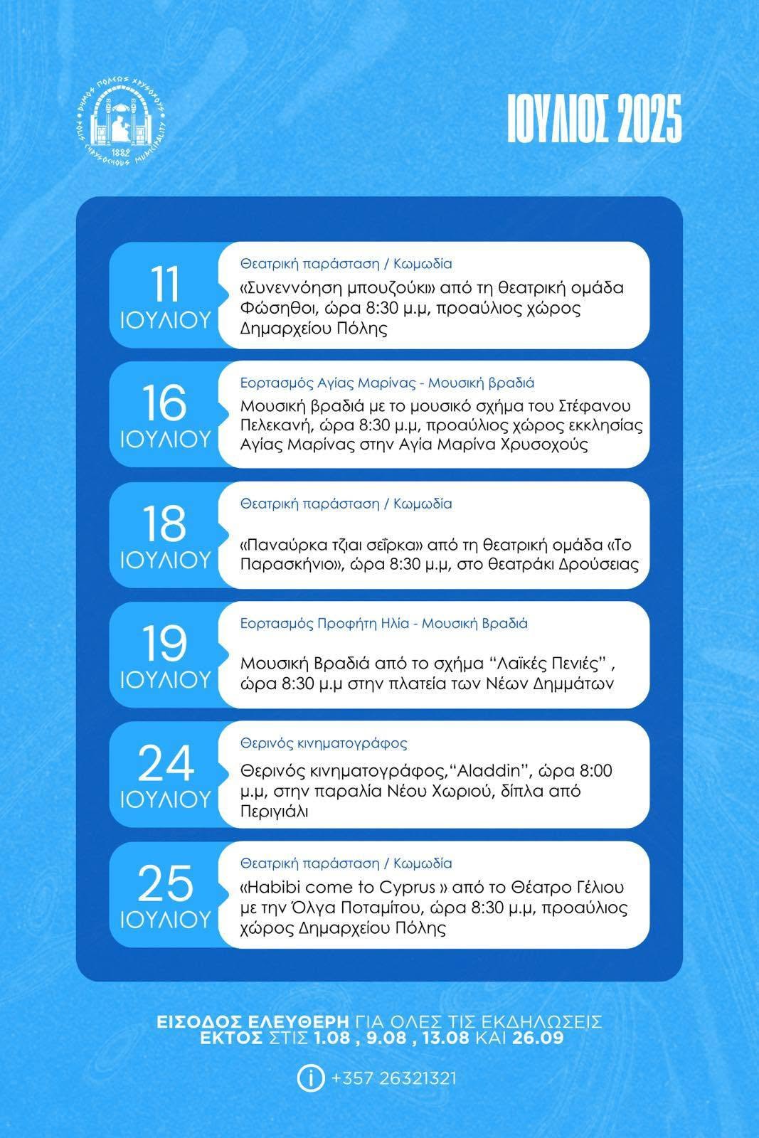 Το πρόγραμμα των καλοκαιρινών εκδηλώσεών του παρουσίασε ο Δήμος Πόλεως Χρυσοχούς, το οποίο θα μας κρατήσει συντροφιά από τον Ιούλιο μέχρι και τον Οκτώβριο!