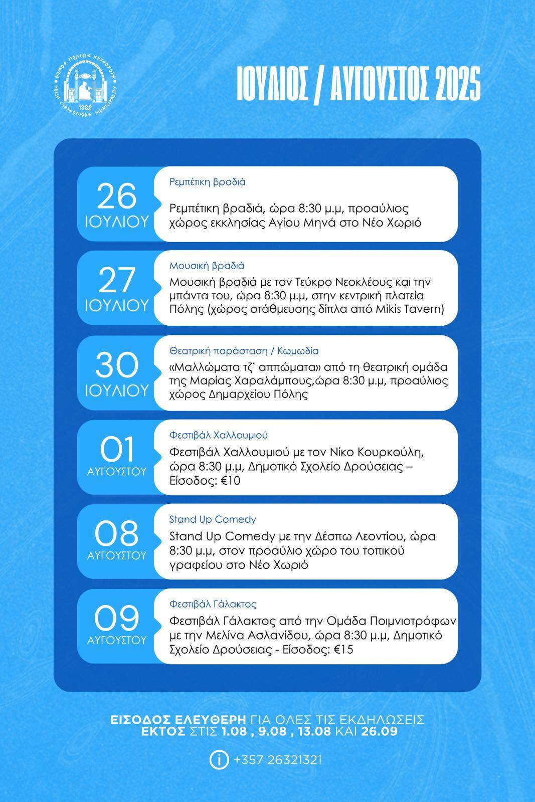 - 1η Αυγούστου: Φεστιβάλ Χαλλουμιού με τον Νίκο Κουρκούλη. Δημοτικό Σχολείο Δρούσιας, 20.30. Είσοδος: €10.