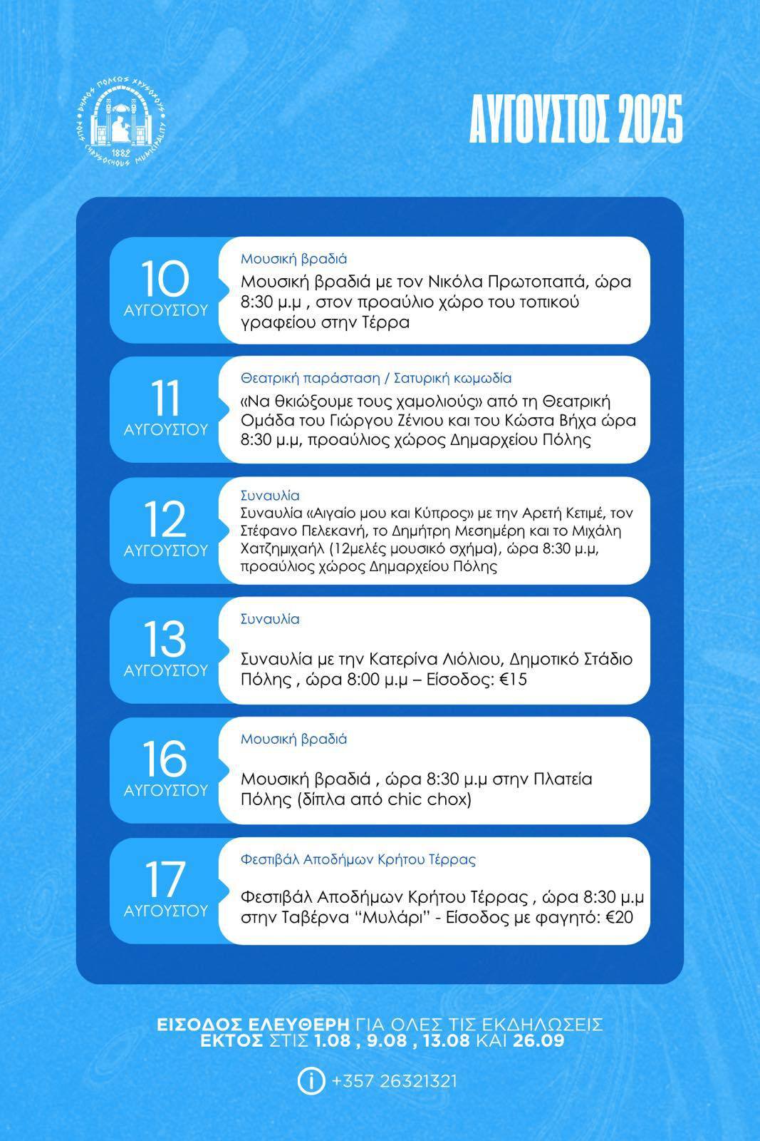 - 17 Αυγούστου: Φεστιβάλ Αποδήμων Κρήτου Τέρρας, Ταβέρνα Μιλάρι, 20.30. Είσοδος με φαγητό: €20.