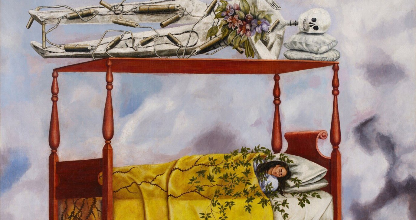Στον πίνακα, η Φρίντα Κάλο εικονίζεται να κοιμάται σε ξύλινο κρεβάτι αποικιακού στιλ που μοιάζει να ίπταται στον ουρανό, ενώ στην οροφή του κρεβατιού της είναι ξαπλωμένος σκελετός, τυλιγμένος με μασούρια δυναμίτη, με ανθοδέσμη στο χέρι και κάτι σαν χαμόγελο.