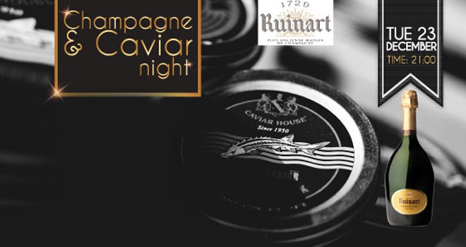 Την Τρίτη 23 Δεκεμβρίου, μας περιμένουν μαγευτικές στιγμές με φόντο τη θάλασσα και τα πολυτελή γιότ... απολαμβάνοντας συνάμα τη νόστιμη, αλμυρή και υφάλμυρη γεύση από χαβιάρι ενισχύοντας τη ρινοστοματική παλέτα μας με τη σαμπάνια Ruinart, η οποία θα προσφέρεται σε ειδικές τιμές για τη βραδιά.