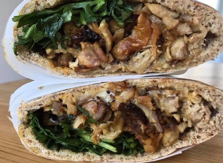 Τρώμε Mellow Pork γύρο χοιρινόμε μόνο 10-15% λίπος, μαριναρισμένομε μέλι, σε παφίτικη πίτα, με σάλτσα ταχίνι, σαλάτα και σταφίδες από Χιλή