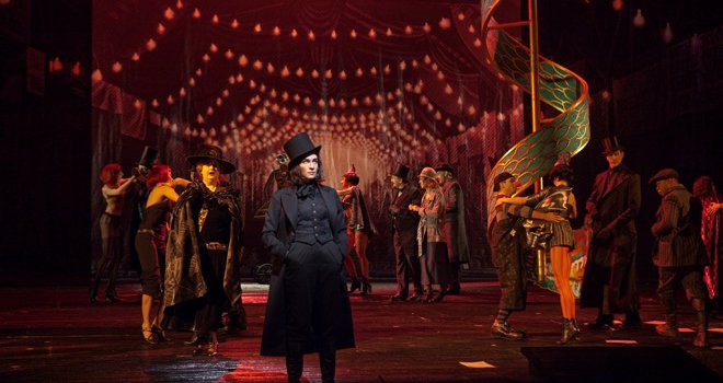 Η Stroman και η σκηνογραφική της ομάδα, με τον Julian Crouch (Satyagraha, The Enchanted Island) και τον σχεδιαστή κουστουμιών William Ivey Long (Cinderella, Grey Gardens, Hairspray), δημιούργησαν ένα art - nouveau σκηνικό που βρίσκει την κορύφωσή του με τον χορό και το τραγούδι των grisettes στο θρυλικό Μαξίμ. Ο Nathan Gunn συμπρωταγωνιστεί ως Ντανίλο και η Kelli O’Hara είναι η Βαλενσιάν.