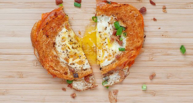 Τηγανίζουμε το τοστ από τη μία πλευρά. Μόλις λιώσει το τυρί, απομακρύνουμε από τη φωτιά, και με ένα ποτήρι ανοίγουμε μια τρύπα στο κέντρο του τοστ. Το ξαναρίχνουμε στο τηγάνι και το τηγανίζουμε από την άλλη πλευρά. Προσεκτικά, σπάμε το αυγό μέσα στην τρύπα που έχουμε ανοίξει.