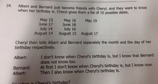 Ο Albert και ο Bernard μόλις έγιναν φίλοι με την Cheryl και την ρώτησαν πότε είναι τα γενέθλιά της. Κι αυτή τους δίνει μια λίστα με τις πιθανές ημερομηνίες: