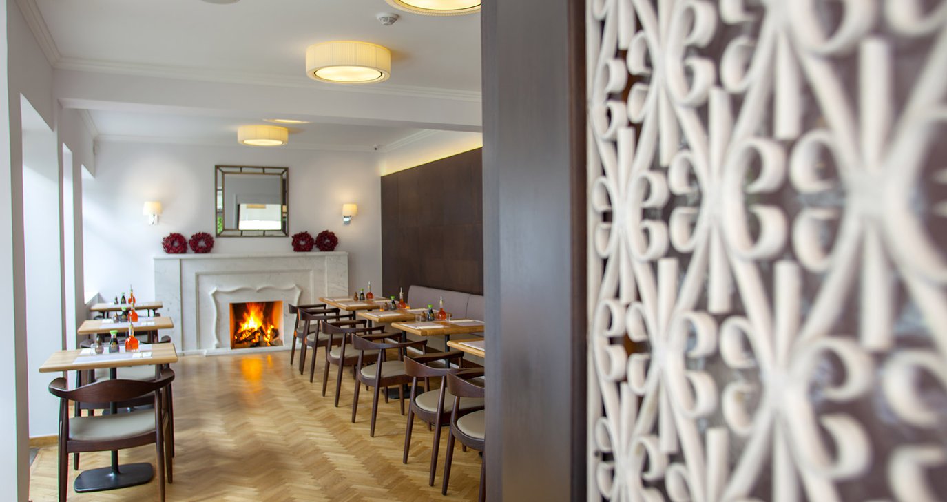 Η αρχιτεκτονική του ίδιου του χώρου είναι κλασσικά ασιατική με τον επιβλητικό σκούρο καφέ ξύλινο τοίχο και τα δύο πανέμορφα τζάκια να κλέβουν τις εντυπώσεις. Κομψή πολυτέλεια αποτελεί το διαχρονικό παρκέ πάτωμα, το οποίο διαμορφώθηκε με ιδιαίτερη προσοχή για να επανέλθει στην αρχική αριστοκρατική του μορφή. Την τέλεια πινελιά στην καλή αισθητική προσθέτει το ζεστό πορφυρό-μωβ χρώμα που επικρατεί, καθώς και τα μεγάλα παράθυρα που περιβάλλουν το χώρο. Όλα είναι συνδυασμένα έτσι ώστε να δημιουργούν μια ιδανική ατμόσφαιρα όπου οι επισκέπτες μπορούν να απολαύσουν ένα αξέχαστο και ήσυχο γεύμα.