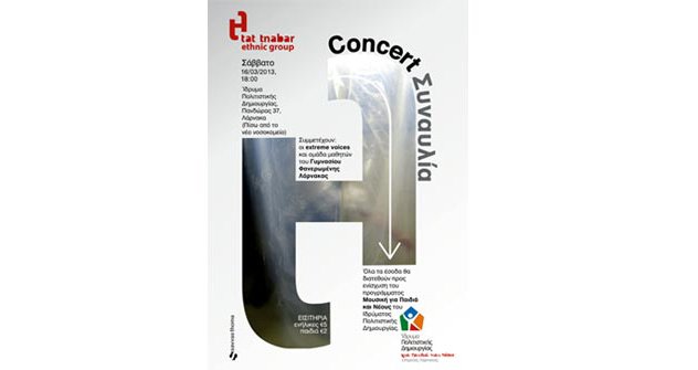 Το Ίδρυμα Πολιτιστικής Δημιουργίας για Παιδιά και Νέους οργανώνει μουσική συναυλία με το ethnic group Tat-Tnabar στον καινούριο χώρο του ιδρύματος! Συμμετέχουν οι Extreme Voices και ομάδα μαθητών από το Γυμνάσιο Φανερωμένης. Όλα τα έσοδα θα διατεθούν προς ενίσχυση του προγράμματος “Μουσική για Παιδιά και Νέους” του Ιδρύματος Πολιτιστικής Δημιουργίας.Το πρόγραμμα “Μουσική για Παιδιά και Νέους” ξεκίνησε τον Ιανουάριο του 2011 με σκοπό την παροχή δωρεάν μουσικών μαθημάτων και μουσικών οργάνων σε παιδιά και νέους που δεν έχουν την οικονομική δυνατότητα να παρακολουθήσουν αυτά τα μαθήματα σε ιδιωτικούς οργανισμούς.