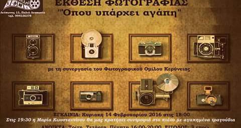 Η έκθεση περιλαμβάνει φωτογραφίες με θέμα την αγάπη σε κάθε της μορφή. Στις 19.30 η Μαρία Κωνσταντίνου θα παίζει στο πιάνο, ερμηνεύοντας τραγούδια αγάπης όλων των εποχών.