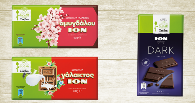 Η νέα σειρά αποτελείται από τις γνωστές και αγαπημένες γεύσεις, ΙΟΝ Αμυγδάλου, ΙΟΝ Γάλακτος και ΙΟΝ Dark Κλασική, σε μέγεθος 60 γραμμαρίων, οι οποίες έχουν δημιουργηθεί με φυσικά γλυκαντικά από το φυτό Στέβια.