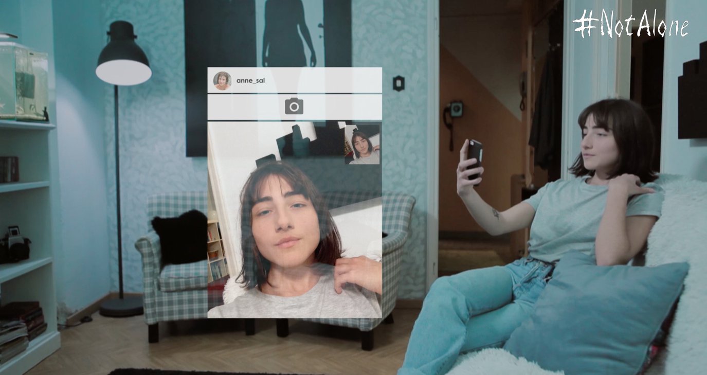Το #NotAlone θίγει το θέμα των υπερβολικών κοινοποιήσεων (over-sharing) μέσα στα social media,αλλά κάτω από ένα πρίσμα υπερφυσικής χροιάς και σύμφωνα με τις συμβάσεις του κινηματογραφικούτρόμου.