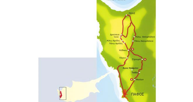 Η διαδρομή αυτή κινείται σε ένα μεγάλο μέρος της περιοχής Ακάμα. Έχει μια ποικίλη γεωλογική ταυτότητα και μεγάλη παράδοση στην αμπελουργία, γι’ αυτό μεγάλες εκτάσεις της καλύπτονται από αμπέλια τα οποία αναπτύσσονται σε ήπιο κλίμα, ένα υψόμετρο 400-650 μέτρων και ασβεστολιθικά εδάφη. Παρόλο που στην περιοχή καλλιεργούνται 19 διαφορετικές ποικιλίες, η περιοχή του Κάθικα φημίζεται περισσότερο για τις λευκές ποικιλίες, με κυριότερη το τοπικό Ξυνιστέρι. Η διαδρομή αρχίζει από την Πάφο, προεκτείνεται στα Μεσόγη, Τσάδα, Άγιο Νεόφυτο, Στρουμπί, Πέγεια, Κάθικα, Ακουρδάλια, Αρόδες, Δρούσεια και Πόλις.