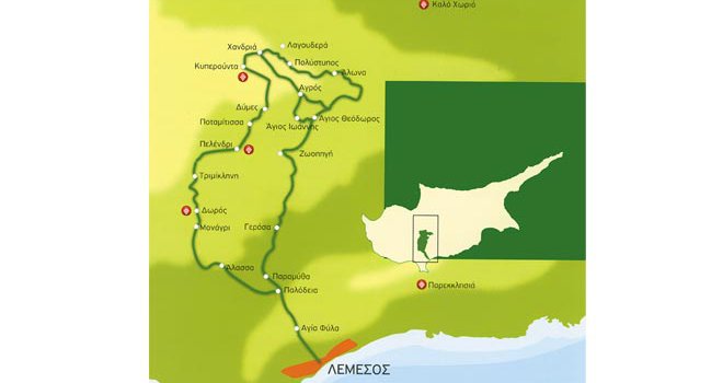 Η διαδρομή είναι ορεινή και εκτείνεται ανατολικά της ψηλότερης κορυφής του Τροόδους. Τα 14 χωριά της μοιάζουν να εμφανίζονται από το πουθενά. Αποτελεί μια από τις πιο πολυσύνθετες ορεινές περιοχές της Κύπρου, περιβάλλεται από τέσσερα δάση -του Τροόδους, του Μαχαιρά, το δάσος Αδελφοί και το δάσος της Λεμεσού. Έχει ψηλές βουνοκορφές, με κυριότερη τη Μαδαρή που φτάνει στα 1,672 μ., ενώ λόγω αρκετής βροχόπτωσης παρουσιάζει πλούσια βλάστηση. Τα 32 χωριά της περιλαμβάνονται στη ζώνη παραγωγής Οίνων Ελεγχόμενης Ονομασίας Προέλευσης Πιτσιλιά. Εκτός από τις τοπικές ποικιλίες Μαύρο και Ξυνιστέρι, καλλιεργούνται ακόμα άλλες 11. Η διαδρομή περιλαμβάνει κυρίως τις περιοχές Λεμεσός, Αγ. Φύλα, Παλώδια, Άλασσα, Τριμίκλινη, Πελένδρι, Ποταμίτισσα, Δύμες, Κυπερούντα, Χανδριά, Πολύστυπος, Άλωνα, Αγρός, Άγ. Ιωάννης, Άγ. Θεόδωρος και Ζωοπηγή.