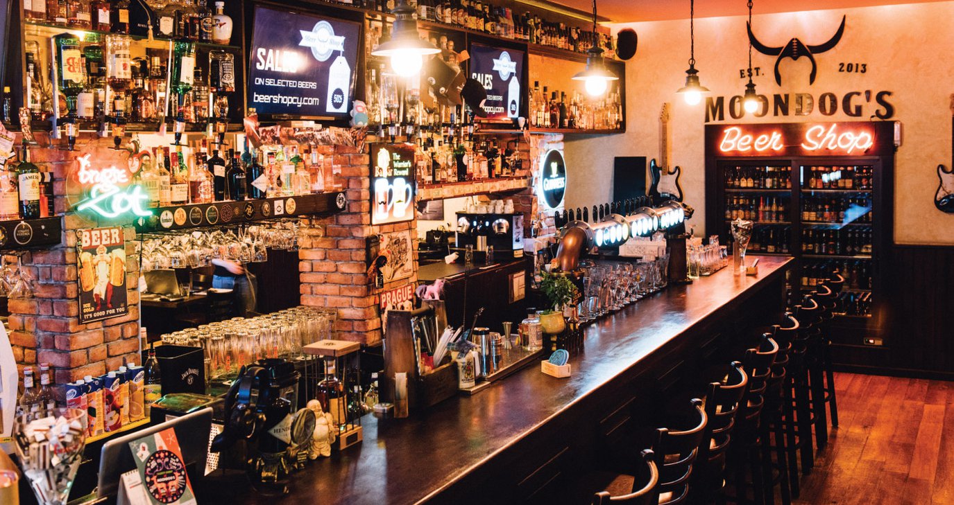 (ιδιοκτήτη) Μάριο Κυπριανού, τους οποίους ενώνει η αγάπη για την μπίρα και τις γεύσεις που της ταιριάζουν. Με την είσοδό σου λοιπόν στον χώρο, η διακόσμηση θα σε μεταφέρει σε ένα αυθεντικό αμερικάνικο μπαρ, όπου επικρατεί το σκούρο ξύλο, οι ψηλές και χαμηλές custom made καρέκλες και ένα μεγάλο, επιβλητικό μπαρ στην είσοδο, πλούσιο σε spirits και με τις μπίρες να είναι ο μεγάλος πρωταγωνιστής. Ένα εστιατόριο που δείχνει με πόσο μεράκι έχει στηθεί o χώρος. Και ως ένα αυθεντικό μπαρ, δεν θα μπορούσε να μην κάνει tribute στη ροκ μουσική σκηνή. Εδώ και μερικά χρόνια, οι τοίχοι και τα ράφια του Moondog’s αφηγούνται ροκ ιστορίες, αφού έχουν εμπλουτιστεί με σπάνια συλλεκτικά αντικείμενα και memorabilia, όπως είναι για παράδειγμα η υπογεγραμμένη κιθάρα του κιθαρίστα των Guns ’n’ Roses, ποτήρια, LPs και άλλα πολλά. Από την άλλη, οι λάτρεις των σπορ θα βρουν εδώ τον παράδεισό τους, αφού οι 21 συνολικά οθόνες που μπορούν να προβάλλουν ταυτόχρονα 7 διαφορετικές αθλητικές διοργανώσεις προσφέρουν μια ξεχωριστή view experience.