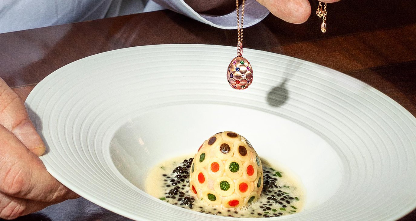 Το πρώτο πιάτο είναι ένα βρώσιμο αυγό Fabergé, εμπνευσμένο από μία από τις πιο εικονικές δημιουργίες της μάρκας: το Μωσαϊκό Αυγό του 1914.