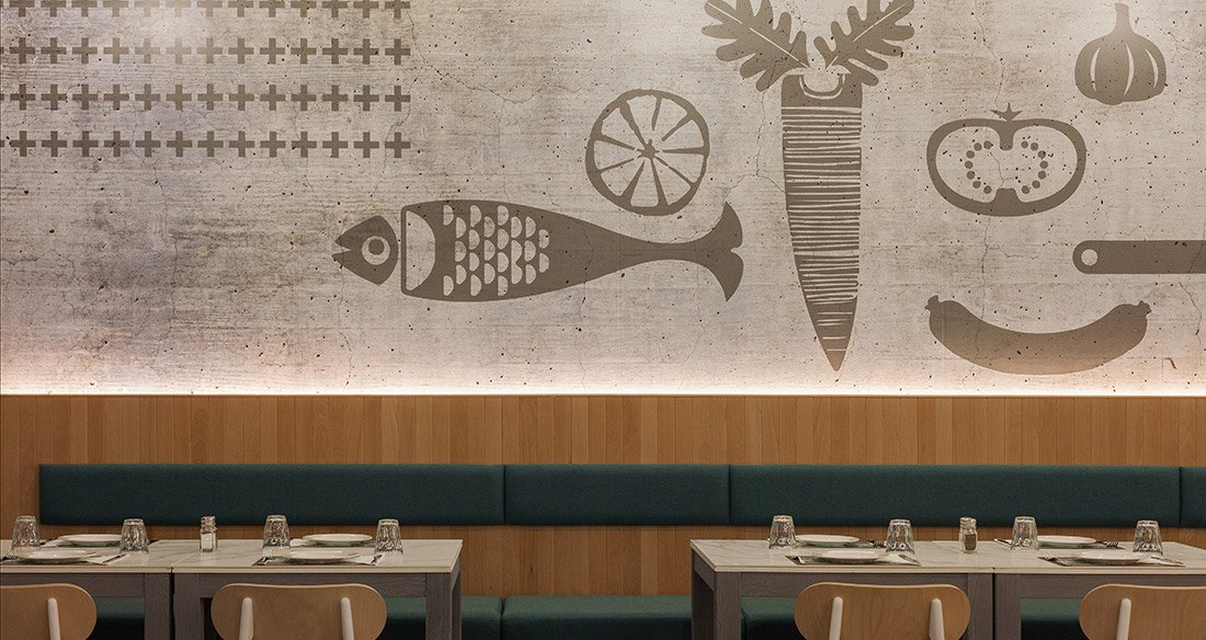 Το μεγάλο παιχνίδι μνήμης, από ξύλο οξιάς και γυαλισμένα κεραμικά πλακάκια με τυπωμένα μοτίβα, παραπέμπει σε παλιό παντοπωλείο και την έννοια της μνήμης σε τρόφιμα και γεύσεις. Οι συρόμενες πόρτες με μεταλλικό σκελετό στην πρόσοψη μεγιστοποιούν τη ροή του φυσικού φωτός στο χώρο ενώ μόλις ανοίξουν και οι τέσσερις ο χώρος γίνεται ενιαίος.