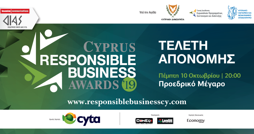 Την Πέμπτη 10 Οκτωβρίου 2019, στο Προεδρικό Μέγαρο, θα πραγματοποιηθεί η τελετή απονομής των Cyprus Responsible Business Awards 2019.