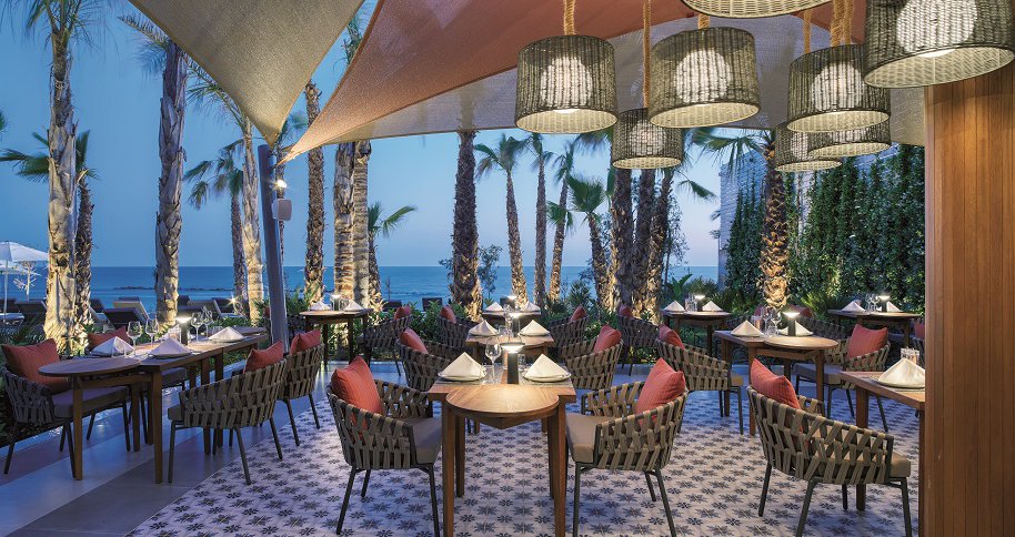 Πρώτο σου μέλημα, είναι να κρατήσεις ένα από τα ρομαντικά τραπέζια του πνιγμένου στο πράσινο αίθριου χώρου, που χαίρεται απλόχερα την αύρα της παρακείμενης θάλασσας, αλλά και την αίγλη του υδάτινου κόσμου του εντυπωσιακού πεντάστερου ξενοδοχείου της Πάφου.