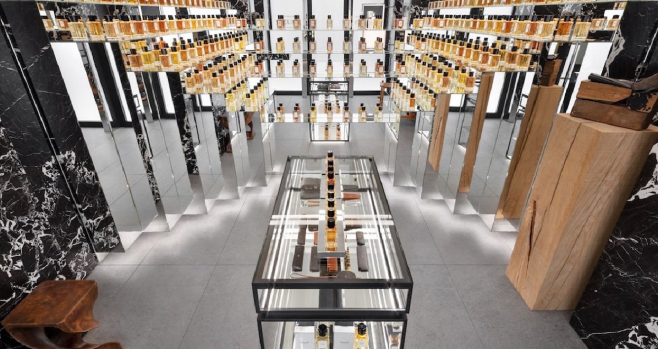 Μια boutique με μινιμαλιστικό design, marble σχέδια στους τοίχους και γυάλινα ράφια τα οποία φιλοξενούν τα μπουκαλάκια των αρωμάτων τα οποία θυμίζουν μπουκάλια από λικέρ.