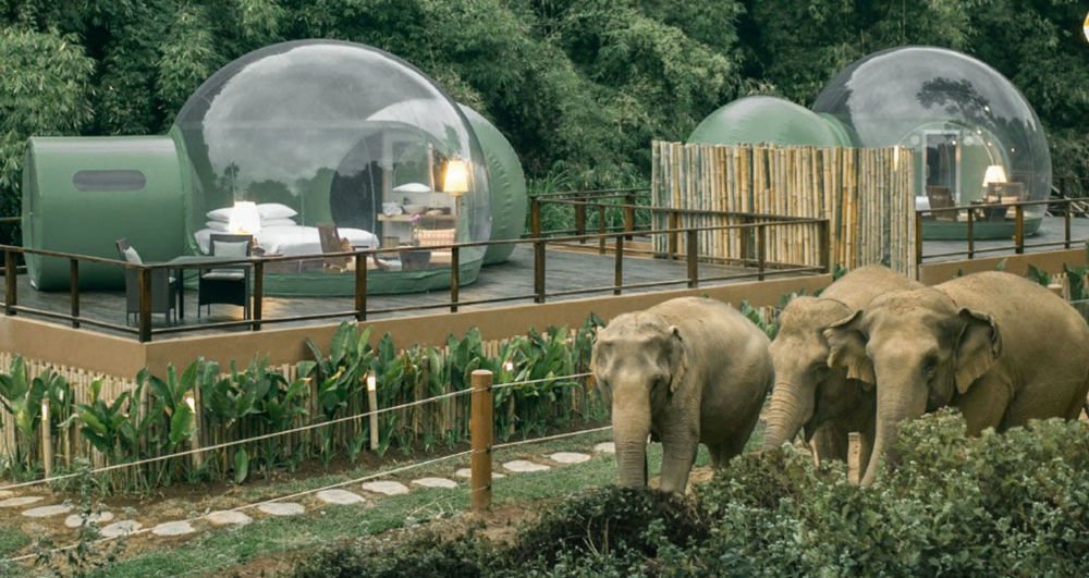 Την ανερχόμενη τάση του glamping πηγαίνει ένα βήμα πιο πέρα το «Anantara Resort» στο Χρυσό Τρίγωνο της Ταϊλάνδης, ένα camp σχεδιασμένο ως καταφύγιο περίθαλψης και φροντίδας ελεφάντων που διασώζονται από ζωολογικούς κήπους, τσίρκα και άλλες συνθήκες εκμετάλλευσης. Τοποθετημένο σε ένα λόφο που επιβλέπει το σημείο συνάντησης της Ταϊλάνδης, του Λάος και της Μιανμάρ, το «Anantara» εγκαινίασε πριν από μερικούς μήνες τα «Jungle Bubbles», μια σειρά από διάφανα, σφαιρικά γυάλινα καταλύματα 22 τ.μ., με υπνοδωμάτιο, σαλόνι και κλειστό μπάνιο, σε πλήρη επαφή με τη φύση, και κυρίως τους ελέφαντες που περιφέρονται ανέμελοι στην έκταση.