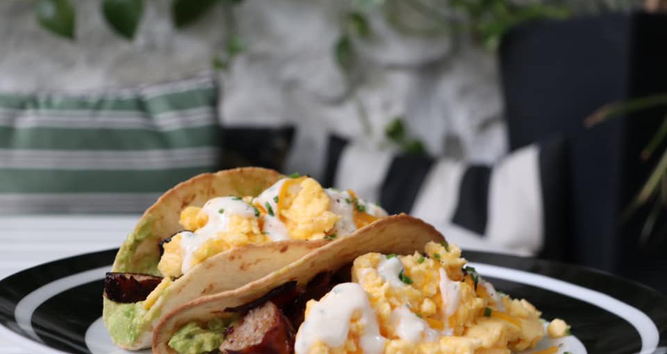 Tacos με γέμιση από αγγλικά λουκάνικα, μπέικον, ομελέτα, αβοκάντο, ντομάτες, τριμμένο τυρί τσένταρ, σάλτσα τυριού και πράσο.