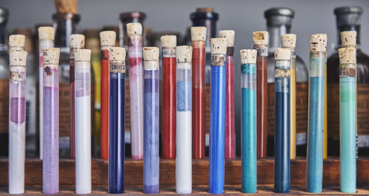 Μέσα σε γυάλινες φιάλες, όλων των μορφών και των μεγεθών, μέσα σε ειδικά κουτιά και χώρους αποθήκευσης, φυλάσσονται σαν κόρη οφθαλμού τα πιο σπάνια χρώματα και χρωστικές ουσίες του κόσμου, που προέρχονται απ’ όλα τα μήκη και πλάτη της οικουμένης (από την Ιαπωνία, μέχρι τη Λατινική Αμερική).