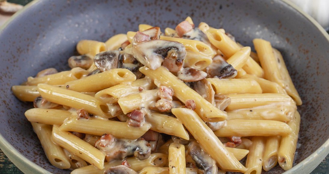 Ζεσταίνουμε ένα τηγάνι σε μέτρια φωτιά και προσθέτουμε το ελαιόλαδο. Σοτάρουμε σε δυνατή φωτιά τα μανιτάρια και μόλις πάρουν έντονο χρώμα χαμηλώνουμε λίγο τη φωτιά και προσθέτουμε το μπέικον μέχρι να καβουρδιστεί. Προσθέτουμε το σκόρδο και μαγειρεύουμε για μερικά λεπτά, μέχρι να μυρίσει. Σβήνουμε με το κρασί και αφού εξατμιστεί η υγρασία προσθέτουμε την κρέμα γάλακτος και σιγοβράζουμε για 1-2 λεπτά. Αλατίζουμε, προσθέτουμε τις πένες και βράζουμε μέχρι να σωθούν σχεδόν όλα τα υγρά και να έχει δημιουργηθεί μία παχύρευστη σάλτσα που θα ντύνει όμορφα τα ζυμαρικά. Ρίχνουμε την παρμεζάνα και το φρεσκοτριμμένο πιπέρι.