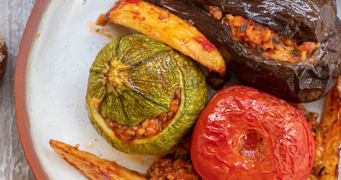 Με ένα κουτάλι γεμίζουμε τις μελιτζάνες, τις ντομάτες, τις πιπεριές χωρίς να τις παραφουσκώσουμε. Σκεπάζουμε τα λαχανικά με το καπάκι τους και τα τοποθετούμε στο ταψί μας. Τα περιχύνουμε με τη σάλτσα ψησίματος, σκεπάζουμε με αλουμινόχαρτο και τα ψήνουμε στους 160°C μέχρι να μαλακώσουν τα λαχανικά. Ανεβάζουμε τη θερμοκρασία στους 200°C, ξεσκεπάζουμε και μαγειρεύουμε για λίγα λεπτά ακόμη ώστε να πάρουν χρώμα τα λαχανικά και να κάνουν μια ελαφριά κρούστα.