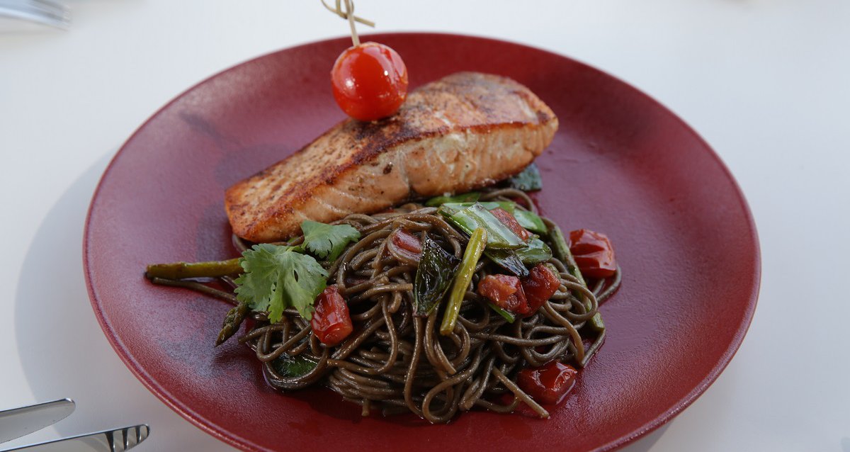 ● Ακολούθως μεταφέρεις όλα τα υλικά σε ένα μπολ σερβιρίσματος και τοποθετείς τον σολομό στην κορυφή.