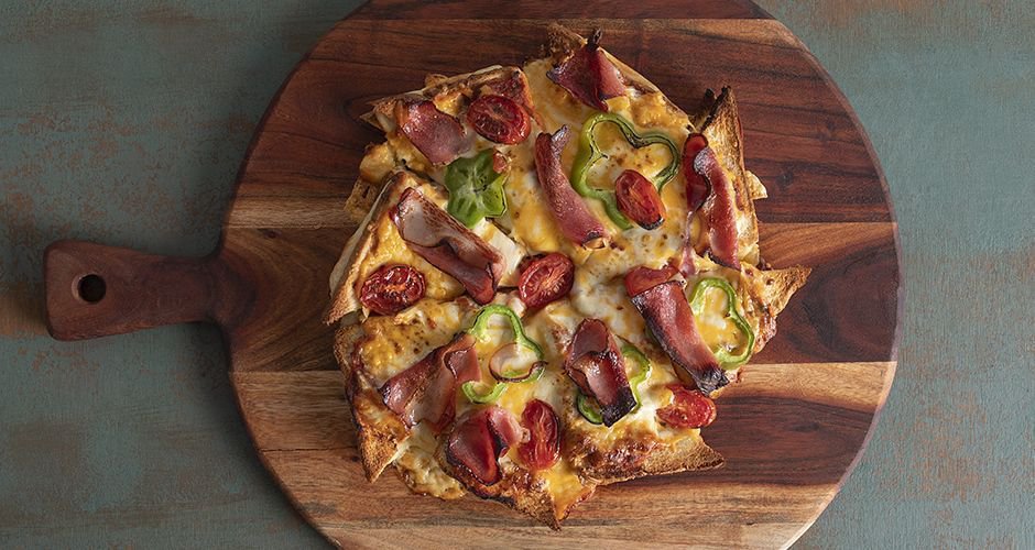 Προσθέτουμε το μείγμα των τυριών, την πιπεριά κομμένη σε ροδέλες, τα ντοματίνια στη μέση και το μπέικον κομμένο στη μέση.