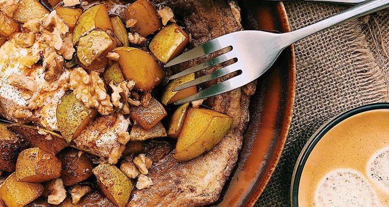 Μια ομελέτα που περιέχει καραμελωμένα αχλάδια, μέλι και καρύδια την οποία μάλιστα μπορείς να φας χώρις ιδιαίτερες τύψεις αφού τα κορίτσια φρόντισαν η συνταγή να περιέχει τα σωστά υλικά ώστε να την φορτώσουν θερμιδικά.