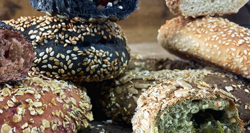 Πράσινο σπανάκι και φέτα ή κόκκινο γεμιστό με παντζάρι και ελιές ή μαύρο με ενεργό άνθρακα γεμιστό με ντομάτα και φέτα ή άσπρο γεμιστό με ζαμπόν και τυρί.