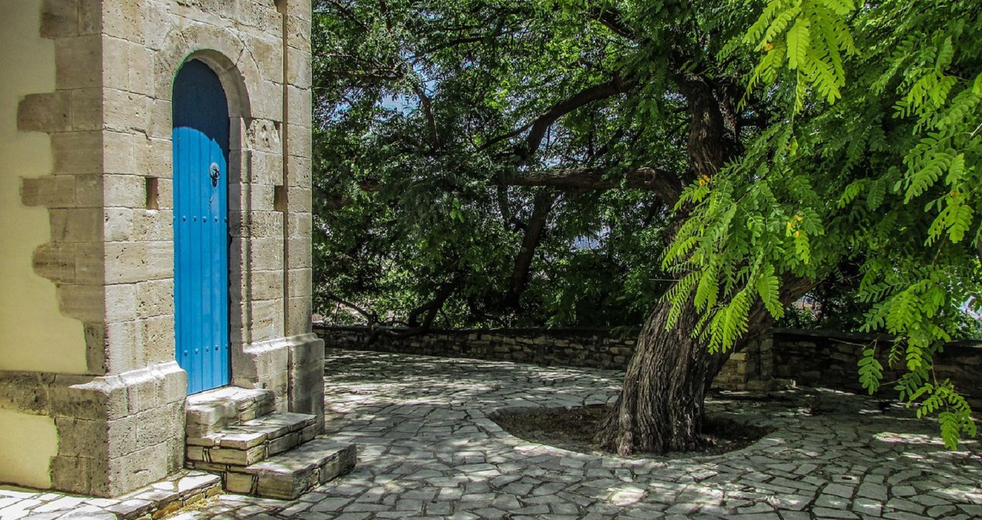 Η χαρακτηριστική αυτή φωτογραφία παραπέμπει σίγουρα στον κεντρικό ναό των Κάτω Λευκάρων, καθώς το εντυπωσιακό αυτό δέντρο, φαίνεται ν’ «αγκαλιάζει» την πόρτα της εκκλησίας, η οποία είναι αφιερωμένη στην Παναγία της Ελεούσας.