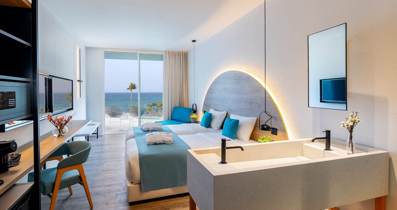 Ο μοντέρνος εσωτερικός χώρος με ενιαία διαρρύθμιση δημιουργεί ένα αυθεντικό και κομψό περιβάλλον, παρέχοντας ταυτόχρονα ιδιωτικότητα σε κάθε χώρο. Τα ιδιωτικά μπαλκόνια με τα άνετα καθίσματα προσφέρουν άμεση ή μερική θέα στη θάλασσα. Στα χαμηλότερα επίπεδα, τα όμορφα χαρακτηριστικά του νερού συνδυάζονται με τη θάλασσα και τους κήπους.