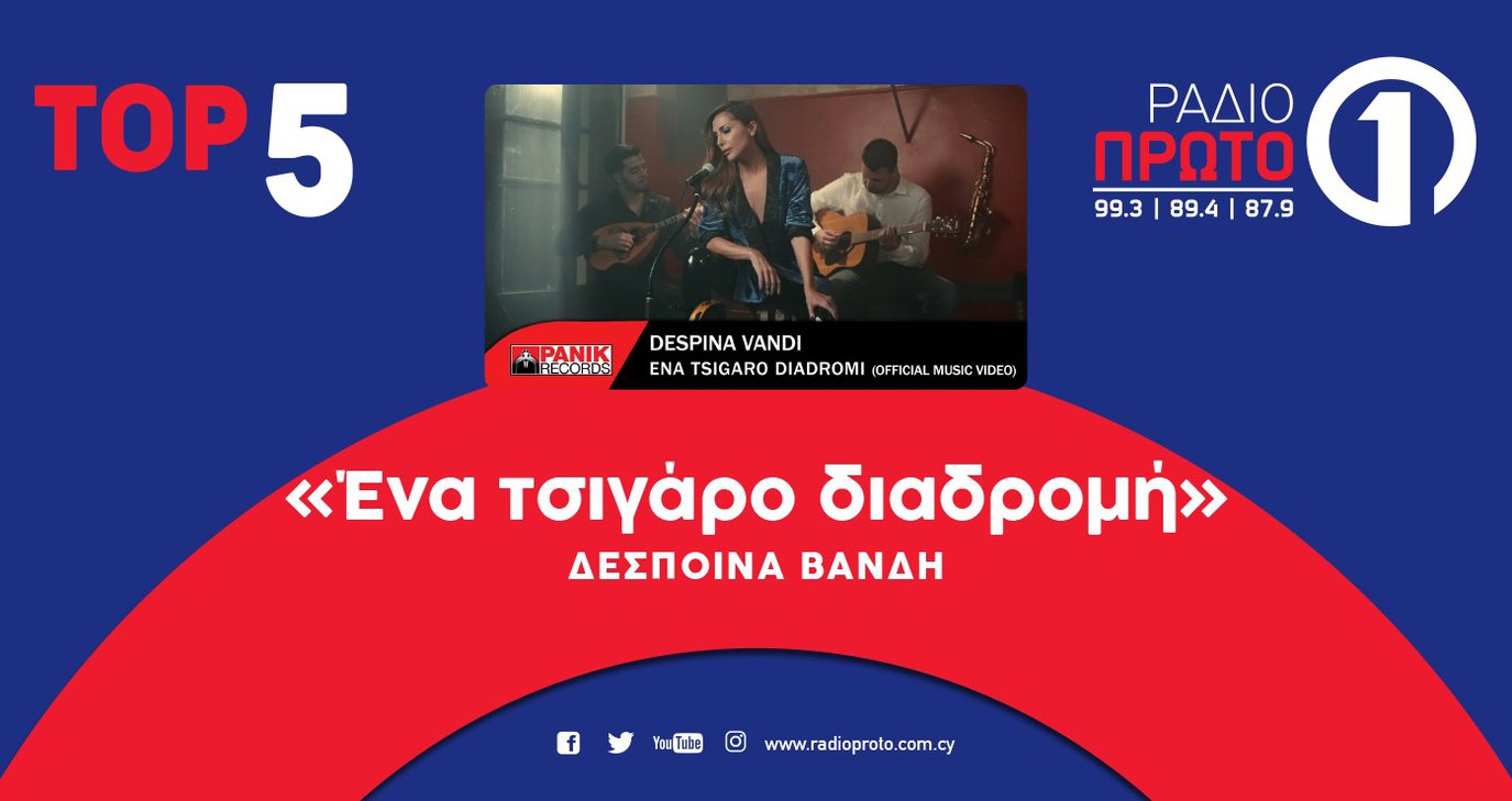 Στην πρώτη θέση βρίσκουμε αυτήν την εβδομάδα τη Δέσποινα Βανδή. Η Δέσποινα συνεχίζει την επιτυχημένη δισκογραφική της πορεία με μία συνεργασία κορυφής: ενώνει τις δυνάμεις της με τον Γιώργο Θεοφάνους και τον Νίκο Μωραΐτη και μας παρουσιάζουν το «Ένα Τσιγάρο Διαδρομή». Με τη μοναδική και χαρακτηριστική χροιά της, η καταξιωμένη και επιτυχημένη καλλιτέχνιδα ερμηνεύει ένα δυναμικό και ιδιαίτερο ζεϊμπέκικο, που έχει ήδη αγαπηθεί από το κοινό μέσα από την πρώτη ραδιοφωνική του μετάδοση τις προηγούμενες ημέρες.