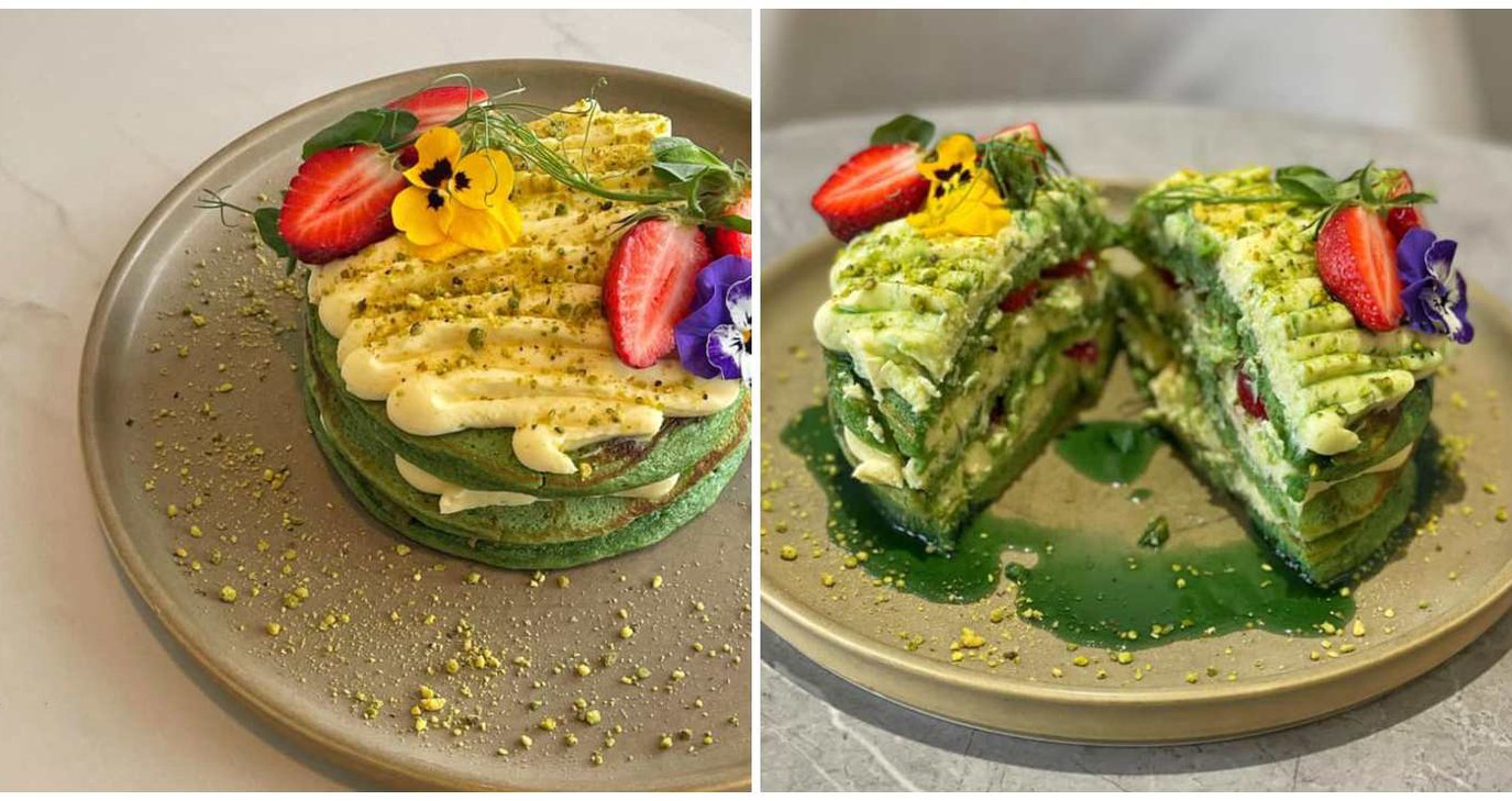 Pistachio pancakes με κρέμα πατισερί, φρέσκες φράουλες & σκόνη φυστίκι. Σερβίρεται με ροδόνερο και pistachio Σιρόπι Φυστίκι. Όλα φτιαγμένα επιτόπου... με αγάπη και τις καλύτερες πρώτες ύλες.