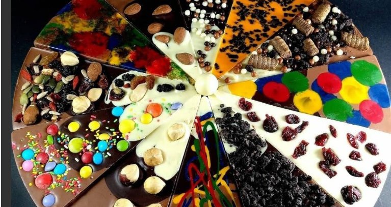 Πίστεψε μας ένα κομμάτι αυτής της θεσπέσιας σοκολάτας-πίτσας δεν αρκεί, αφού δεν ξέρεις τι να πρωτοδιαλέξεις σε γεύσεις: Σοκολάτα με ολόκληρο φουντούκι, σοκολάτα με αμύγδαλο, άσπρη και μαύρη σοκολάτα, praline waffers, Nut Mix, Choco crispies, Kids max, Chocolate hearts, σοκολάτα με smarties είναι μερικές από τις επιλογές που θα γλυκάνουν τον ουρανίσκο σου.