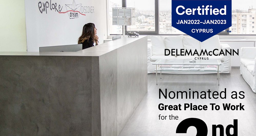 Μια πολύ σημαντική αναγνώριση εξασφάλισε η DELEMA McCANN στην αξιολόγηση του εργασιακού περιβάλλοντος εταιρειών από το Great Place to Work®, γεγονός το οποίο την καθιστά ως την πρώτη εταιρεία του κλάδου διαφήμισης/επικοινωνίας στην Κύπρο, που πιστοποιείται για δεύτερη συνεχόμενη χρονιά.