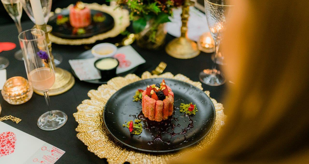 Η βραδιά ξεκίνησε με ένα διαφορετικό ποτό, ζεσταίνοντας την ατμόσφαιρα με ένα ροζέ Προσέκο με σιρόπι τσιχλόφουσκας και συνεχίστηκε με ένα amuche-buche από αυγά λευκού οξύρρυγχου και κρέμα σαμπάνιας. Το κυρίως πιάτο ήταν ένα μαγευτικό βοδινό φιλέτο, συνοδευόμενο από ριζότο με βασιλομανίταρα, βούτυρο τρούφας και τραγανή γκοφρέτα παρμεζάνας. Εκτός από το επιδόρπιο της κόκκινης σαρλότας με τα φύλλα χρυσού και το μους των φρούτων του δάσους, οι παρευρισκόμενοι απόλαυσαν και ένα άκρως ρομαντικό petit four, μακαρόν με γκανάζ τριαντάφυλλου με ζαχαρωμένα ροδοπέταλα, μια νοστιμιά που σίγουρα δεν συναντά κανείς κάθε μέρα.