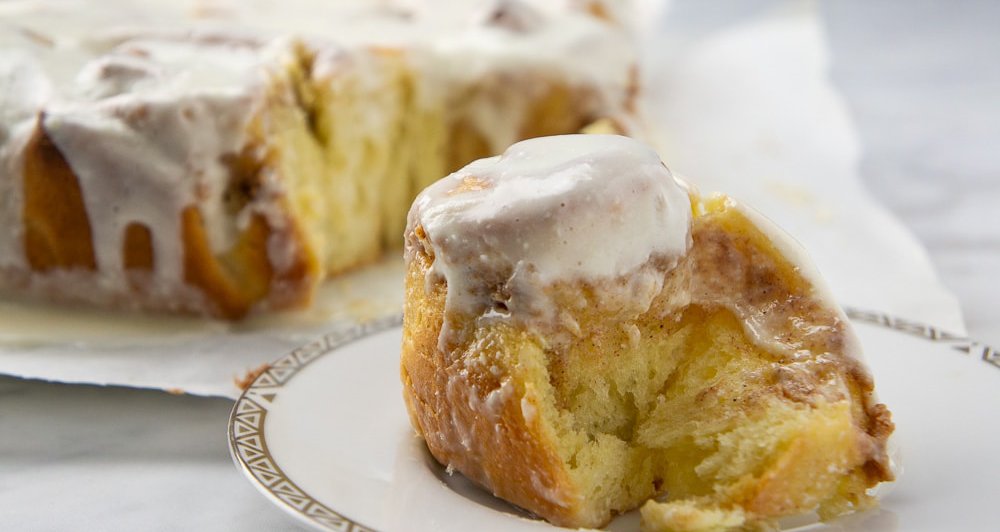 Απολαυστικό cinnamon rolls, γλασαρισμένο με κρέμα τυριού που σερβίρονται με κομμένη μπανάνα και θρυμματισμένα πεκάν.