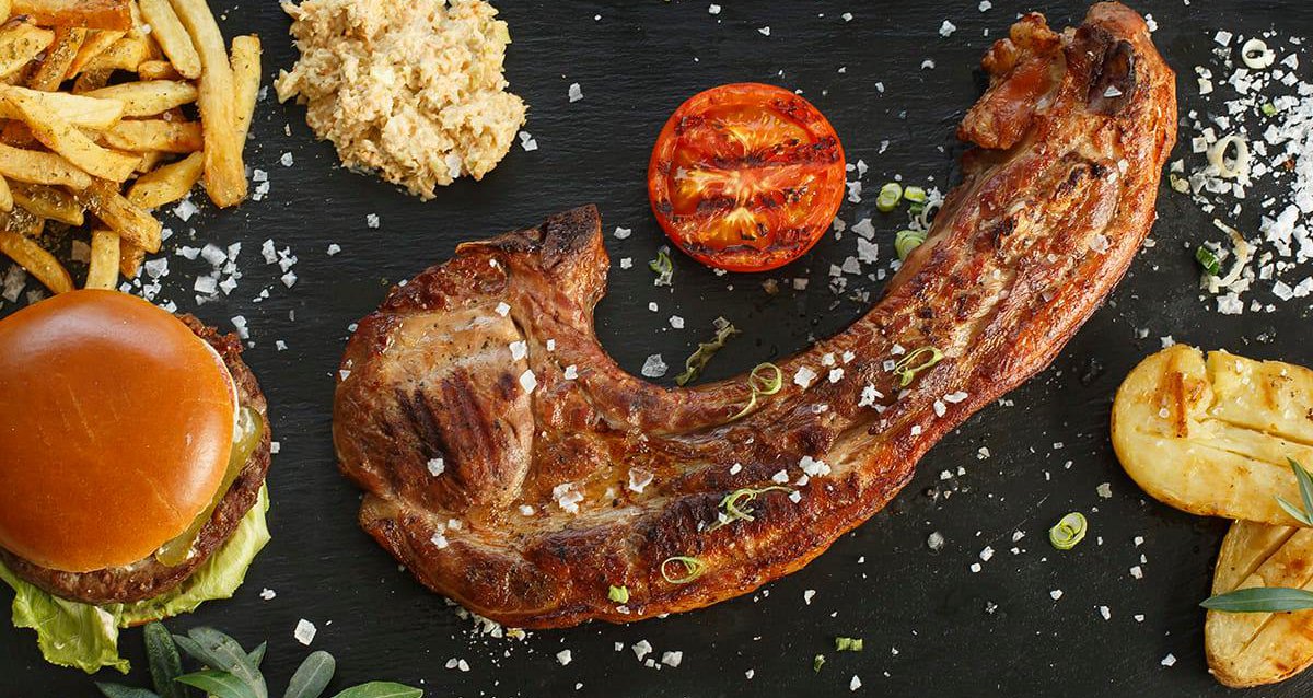 Από το μενού του ξεχωρίζει η χοιρινή μπριζόλα, η οποία ζυγίζει 1,5 κιλό και συνοδεύεται με σπιτική σαλάτα coleslaw, άσπρο γαλλικό ψωμάκι και πατάτες.