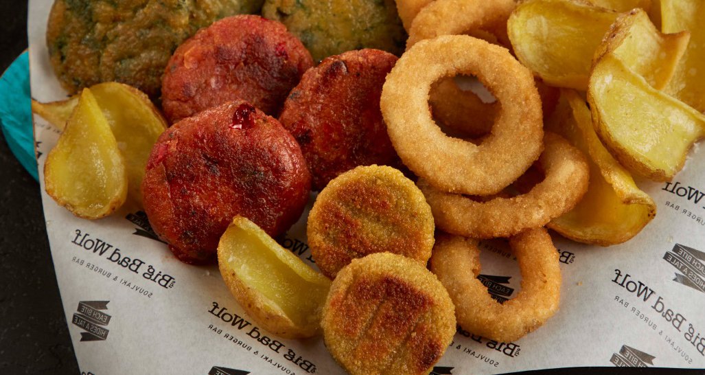 Ο Κακός Λύκος λοιπόν σου ετοίμασε το πιο νόστιμο και λαχταριστό vegan box, με ντοματοκεφτέδες και κολοκυθοκεφτέδες, τραγανά onion rings & φαλάφελ και φρεσκοτηγανισμένες πατάτες.